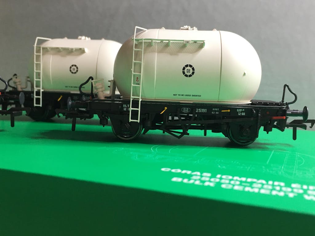 At first, the wagons carried an all-over medium grey livery with CIÉ roundels and ‘Bulk Cement’ text on the body sides. In the early 1970s, they were repainted with orange/tan bodies and grey chassis. Later in that decade, they received a further repaint which saw them turned out with ivory bodies and black chassis. This latter livery was carried until withdrawal, although it was often hidden below several layers of cement dust! While wearing this colour scheme, a small number of wagons also received ‘Irish Cement’ branding.
